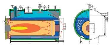 Конструкция камеры сгорания жаротрубная, с реверсивным формированием факела горелки внутри плавающей топки котла. Второй ход топки оснащен специальными турбулизаторами из нержавеющей стали, предназначенными для повышения КПД котла. Камера сгорания котла имеет специальную, устойчивую к тепловым деформациям конструкцию и снабжена конденсатоотводчиком. Применение в качестве материала турбулизаторов - нержавеющей стали, позволяет значительно увеличить срок их службы. Котел I.VAR модели SuperRAC-5230 укомплектован дополнительнойвнешней термоизоляцией передней стенки, что не позволяет ей нагреваться свыше 55 С и температура поверхности нагрева соответствует нормам «Правил устройства и безопасной эксплуатации паровых и водогрейных котлов».