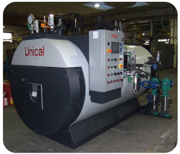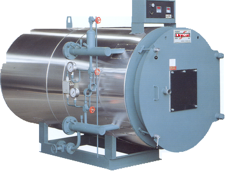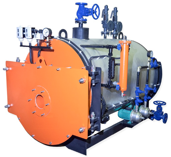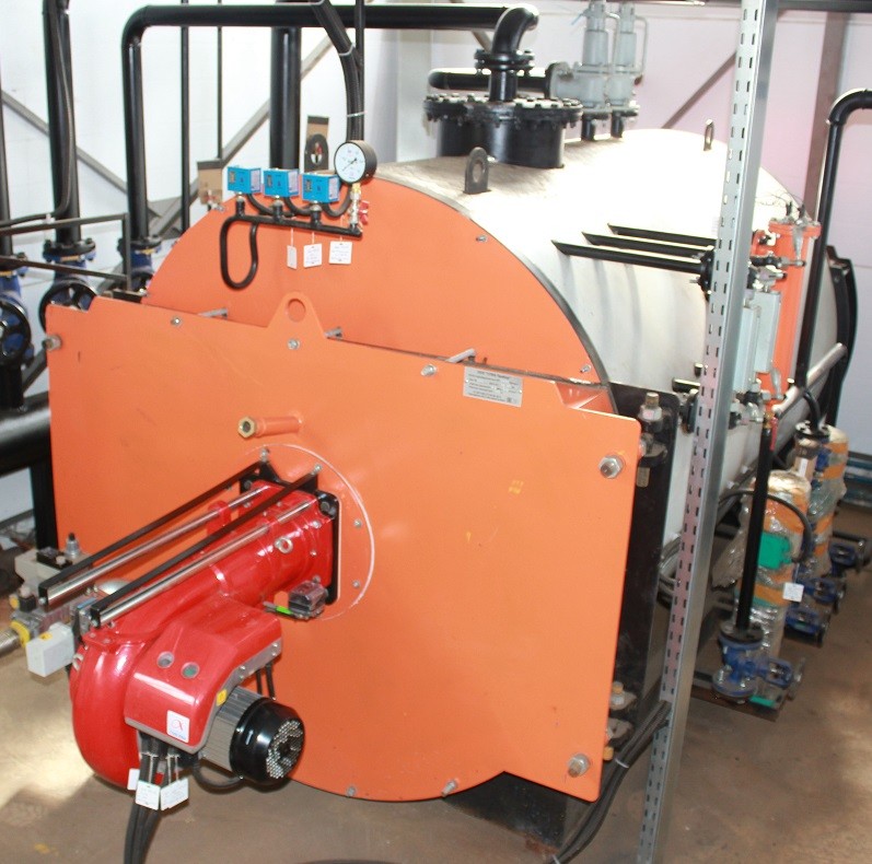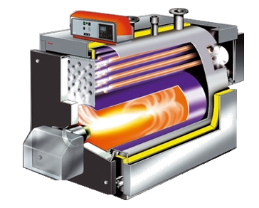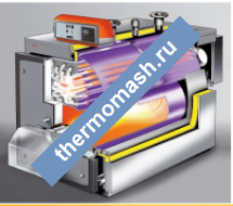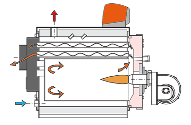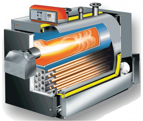 Котел жаротрубный, двухходовой, работающий по принципу обратного пламени.